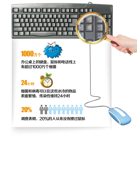 你的办公桌有多久没消过毒了?有调查显示,办公桌上平均每个键盘、鼠标和电话线上有超过1000万个细菌,而这些细菌传染性可维持24小时。记者昨日从市内多所医院了解到,因为平时不注重办公桌卫生,因此染上皮肤病等疾病的患者屡有接诊。